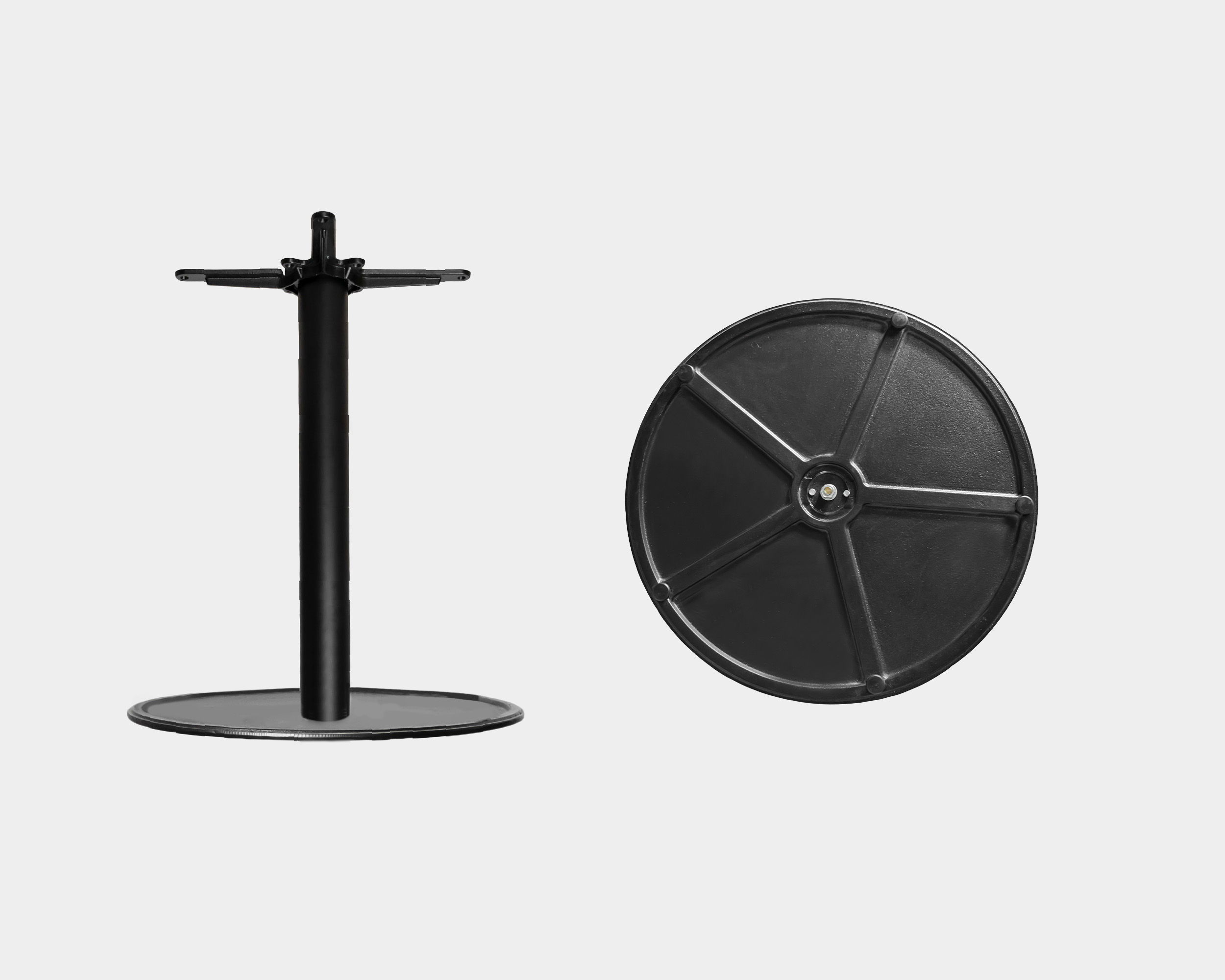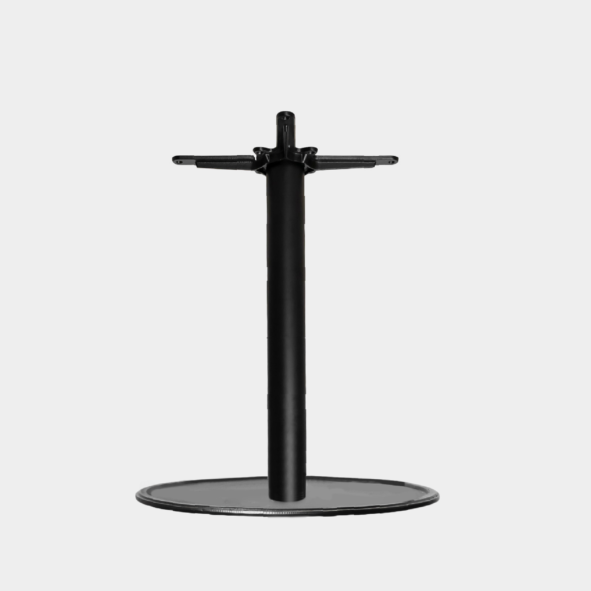Base metalica desarmable con base superior e inferior en fierro fundido Cross Legs, columna de fierro cuadrado con templador interno para ensambles de bases superior e inferior. Acabado en pintura electrostática epoxy-polyester con regatones regulables en altura.