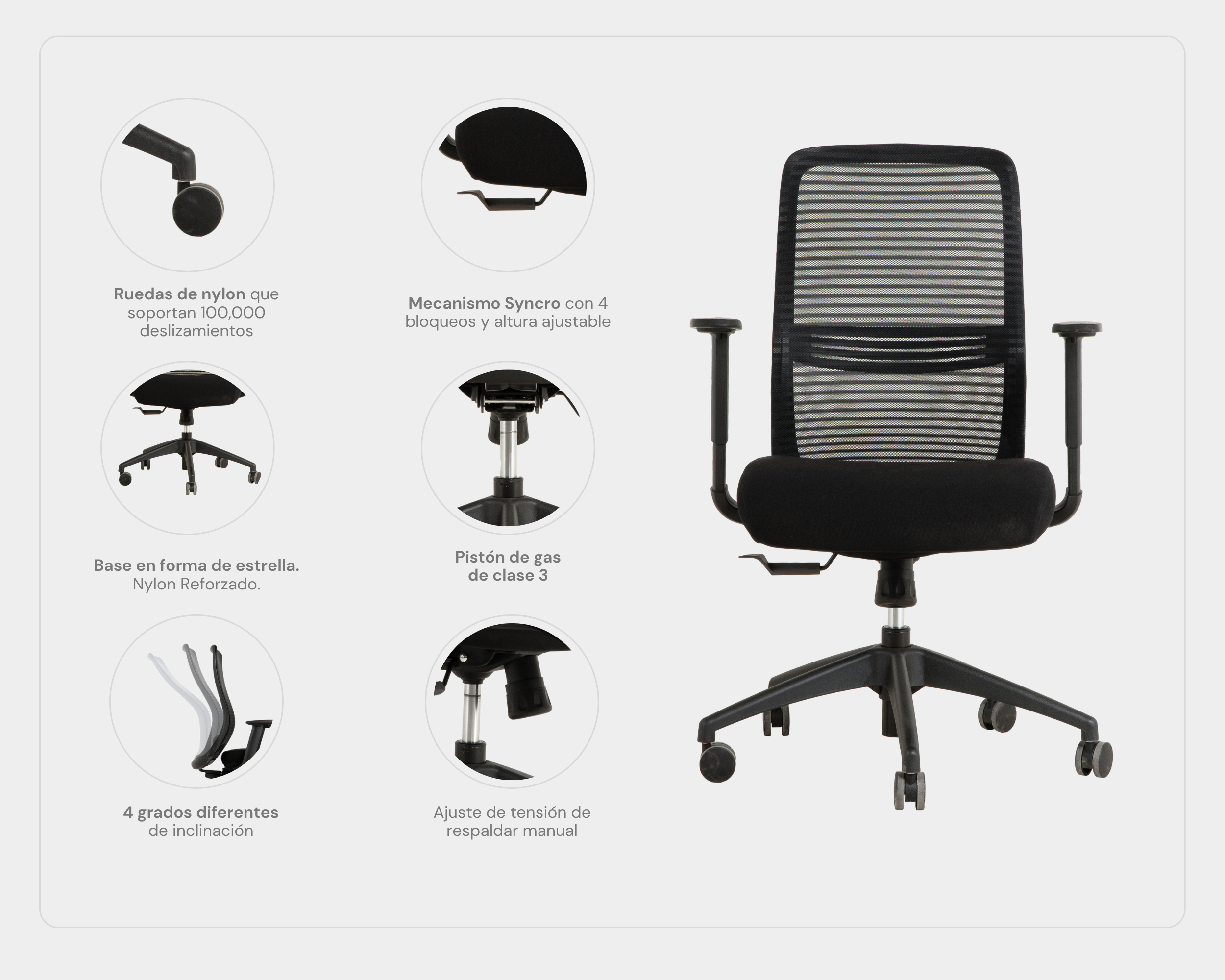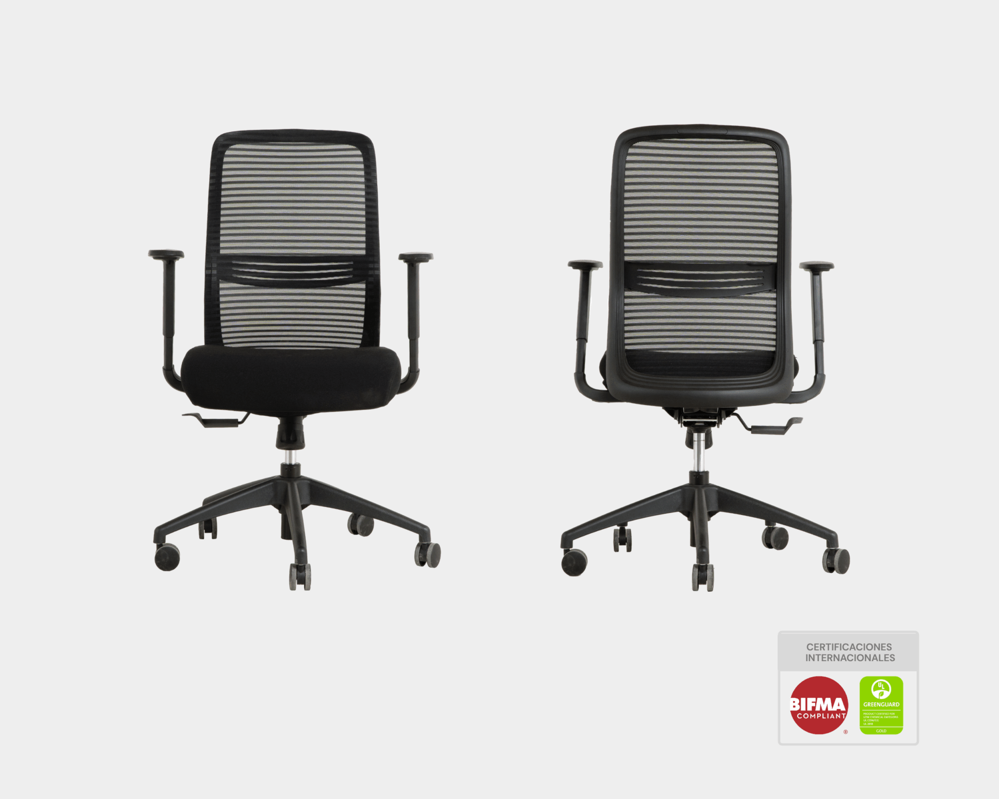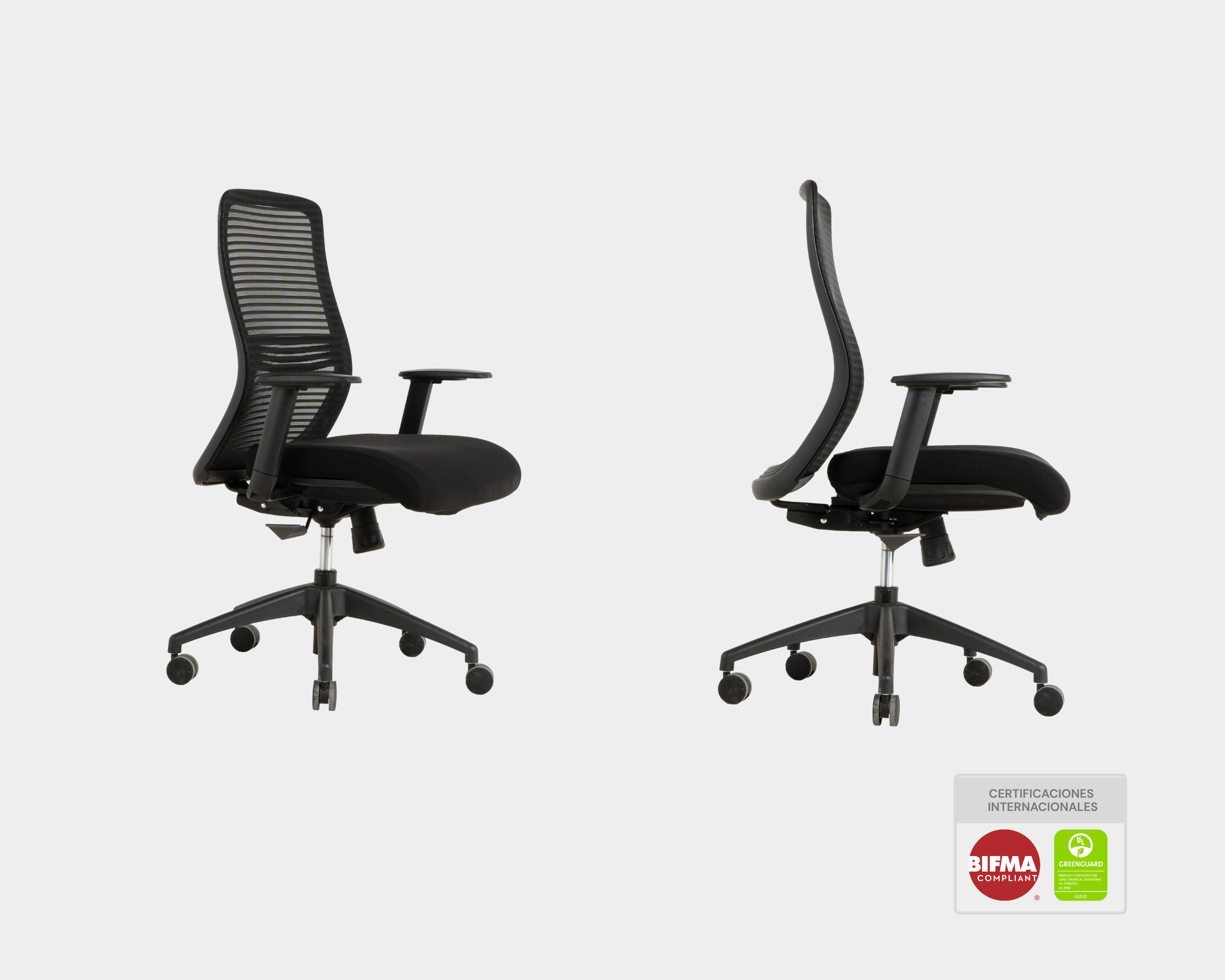 Silla de oficina NIHMO3. Estructura de nylon de alta calidad con malla de alto tránsito marca WINTEX superando los 50,000 ciclos Martindale. Soporte lumbar regulable en altura. Reposabrazos 1D ajustable en altura con almohadilla de PU. Asiento de espuma moldeada y tapizado en tela de alto tránsito marca GABRIEL, tapiz asiento desenfundable. Mecanismo simple con función reclinable de 3 posiciones de bloqueo y deslizamiento del asiento en profundidad. Elevador de gas KGS Clase 3 ajustable en altura. Base de nylon de 680 mm de diámetro. Ruedas giratorias 360° de nylon de 60 mm. Certificación BIFMA, GREENGUARD Y ERGONOMÍA.