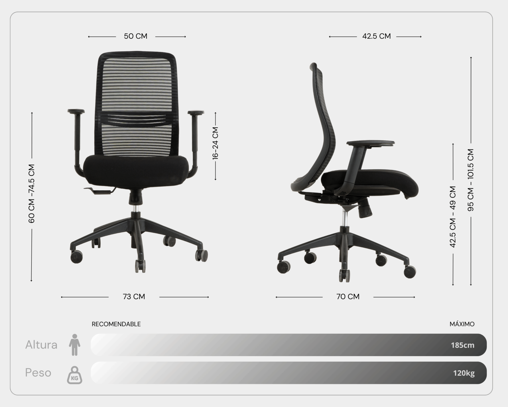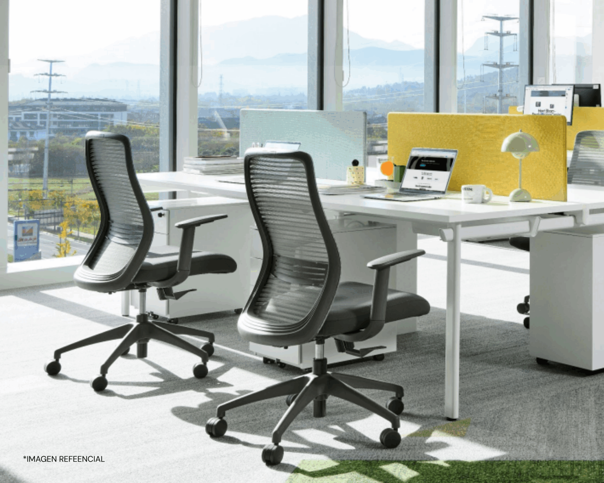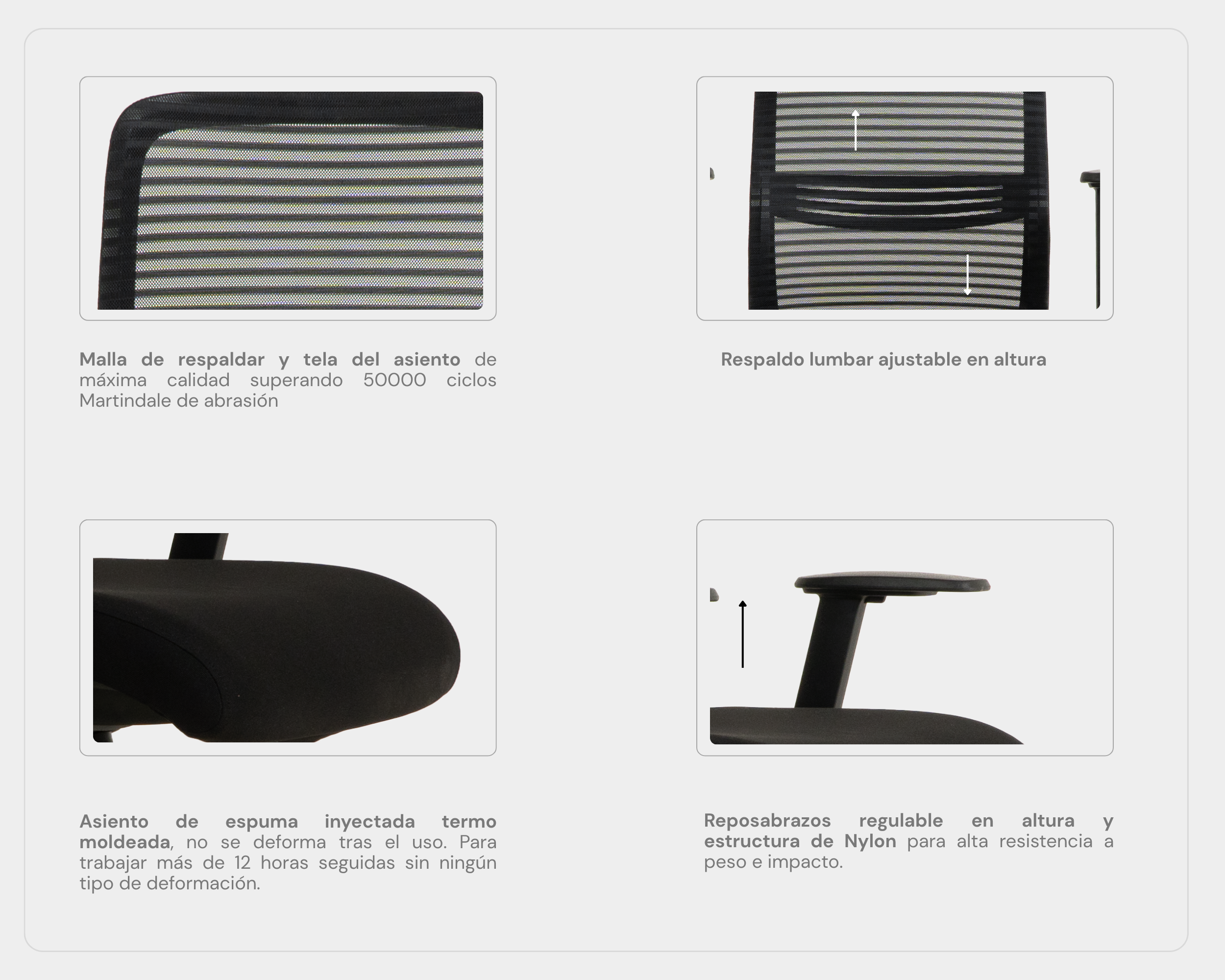 Silla de oficina NIHMO3. Estructura de nylon de alta calidad con malla de alto tránsito marca WINTEX superando los 50,000 ciclos Martindale. Soporte lumbar regulable en altura. Reposabrazos 1D ajustable en altura con almohadilla de PU. Asiento de espuma moldeada y tapizado en tela de alto tránsito marca GABRIEL, tapiz asiento desenfundable. Mecanismo simple con función reclinable de 3 posiciones de bloqueo y deslizamiento del asiento en profundidad. Elevador de gas KGS Clase 3 ajustable en altura. Base de nylon de 680 mm de diámetro. Ruedas giratorias 360° de nylon de 60 mm. Certificación BIFMA, GREENGUARD Y ERGONOMÍA.