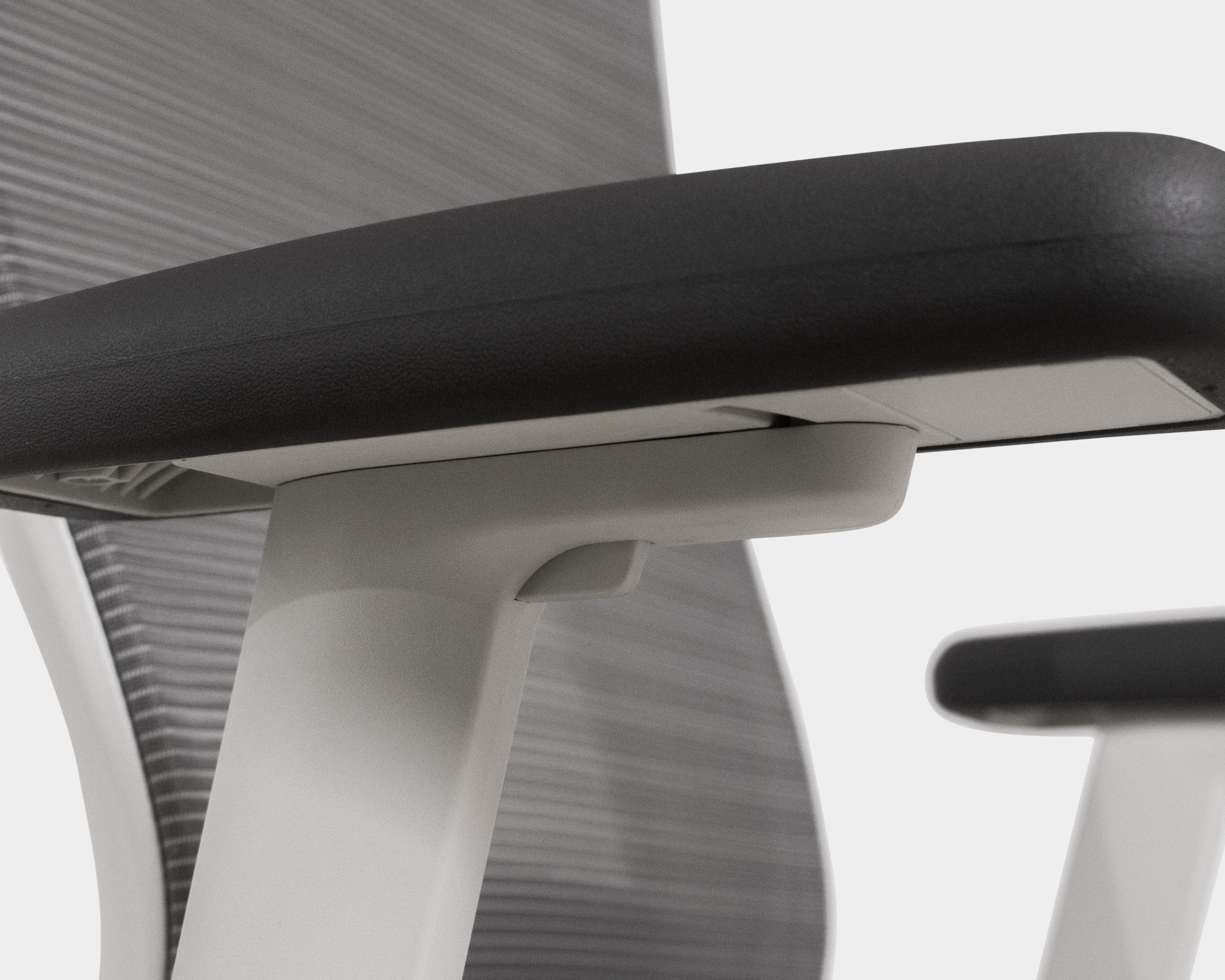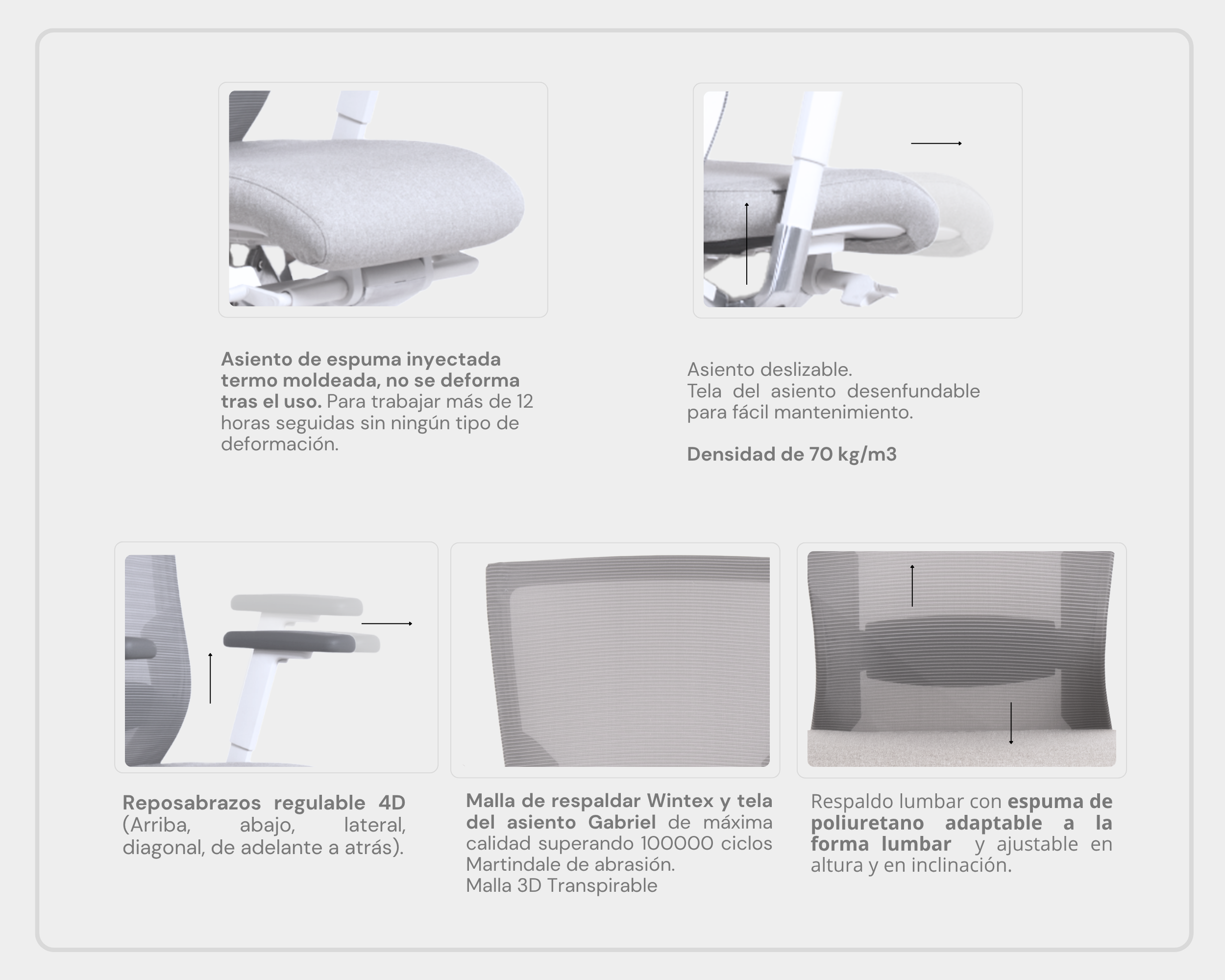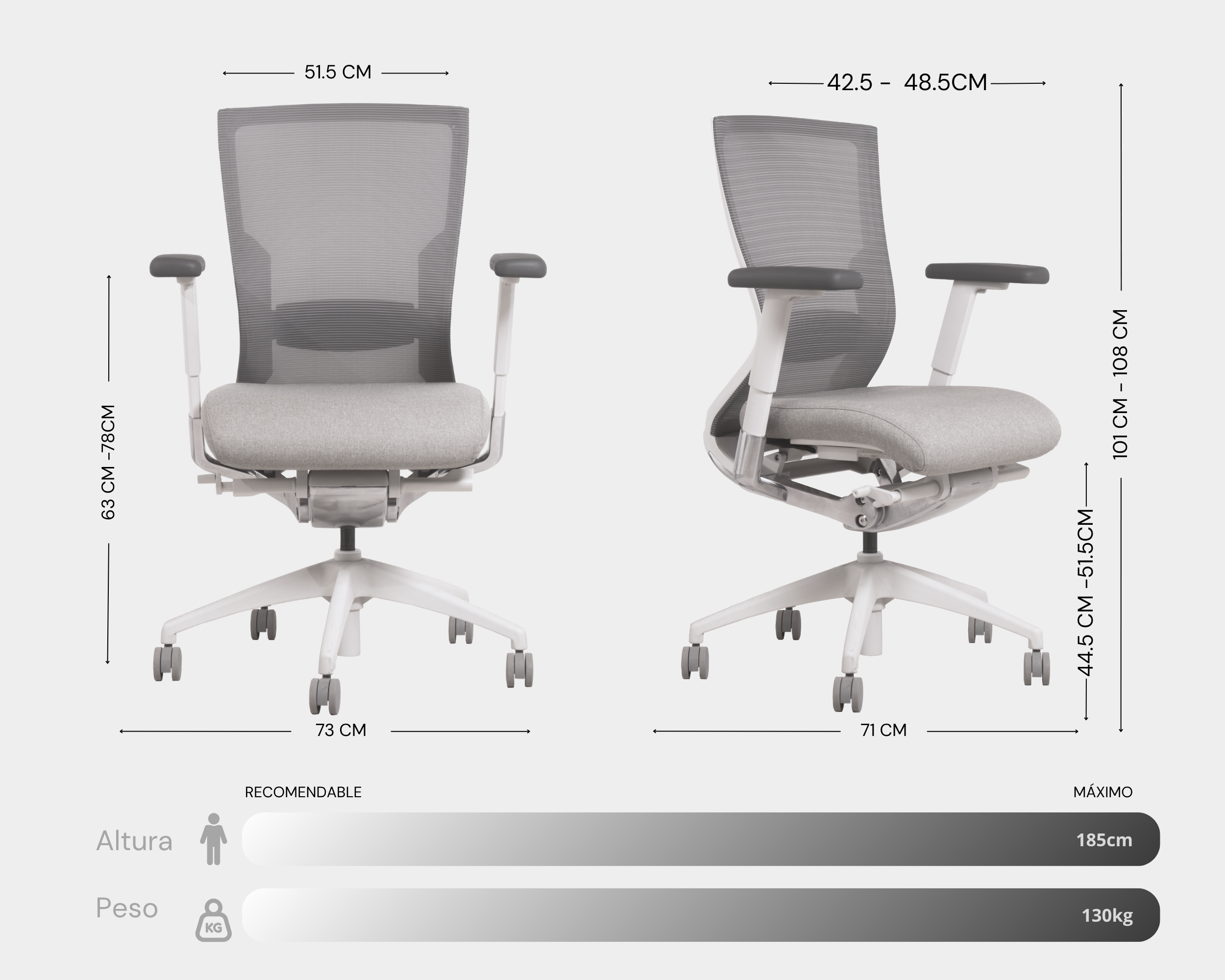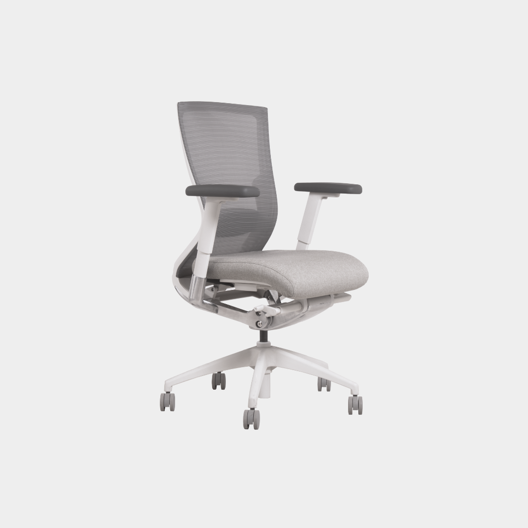 Reposabrazos ajustable 3D altura, profundidad y ángulo con almohadilla de PU. Asiento desenfundable de espuma moldeada y tapizado con tela GABRIEL. Mecanismo sincronizado de aluminio pintado en color blanco Muti-Tilter (Bloquea el limite de recorrido del respaldo) con asiento deslizante en profundidad y con regulador de tensor de respaldo.