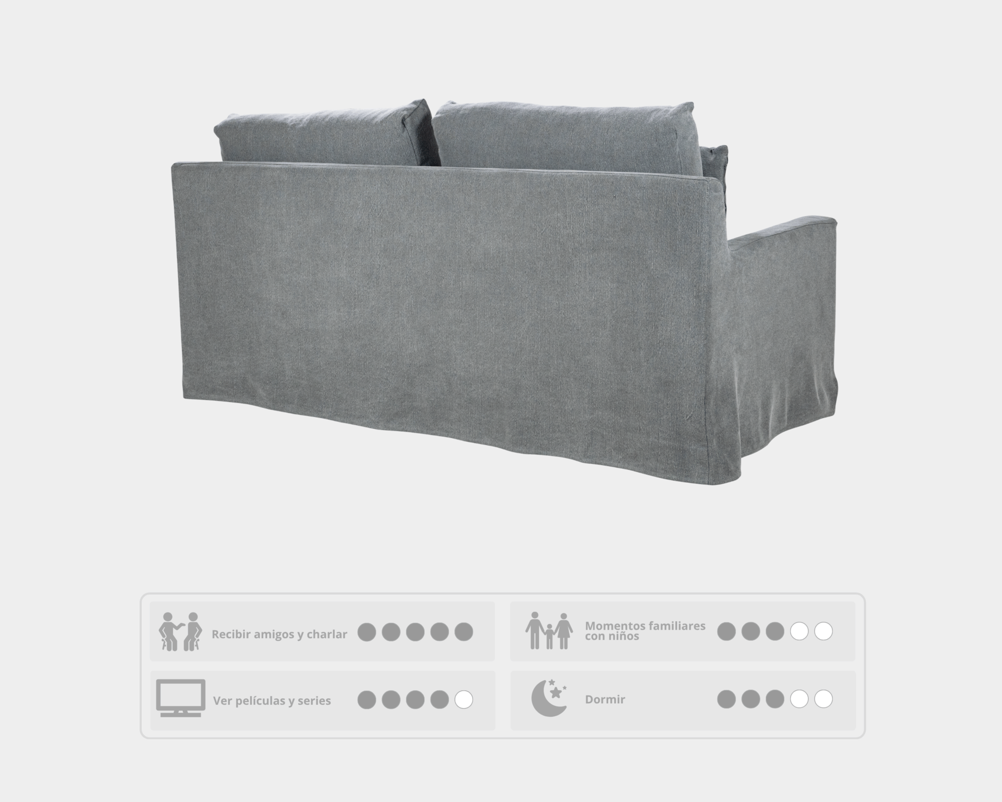 “Sofá con estructura sólida de madera de pino y contrachapado. Asiento con espuma de alta resiliencia de 36 kg/m³ en los cojines y 25 kg/m³ en las zonas blandas para un confort equilibrado. Respaldo con relleno de fibra que aporta suavidad y soporte. Patas de plástico resistentes y discretas.”